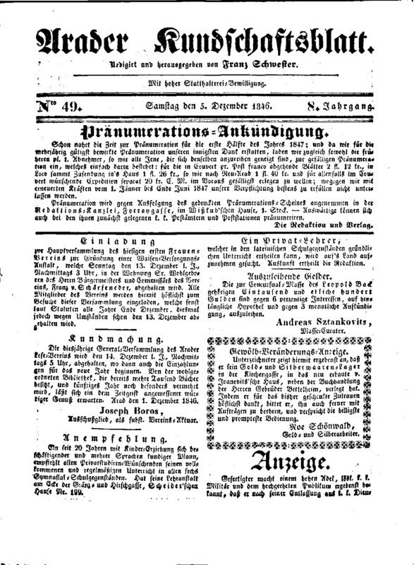 Arader Kundschaftsblatt, nr. 49, 1846-12-05