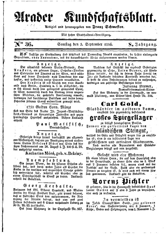 Arader Kundschaftsblatt, nr. 36, 1846-09-05