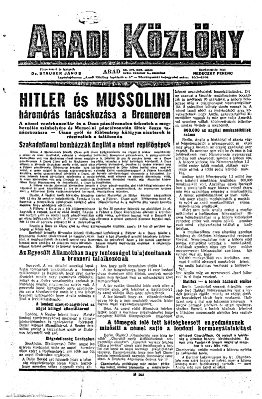Aradi Közlöny, anul LV, nr. 226, 1940-10-05