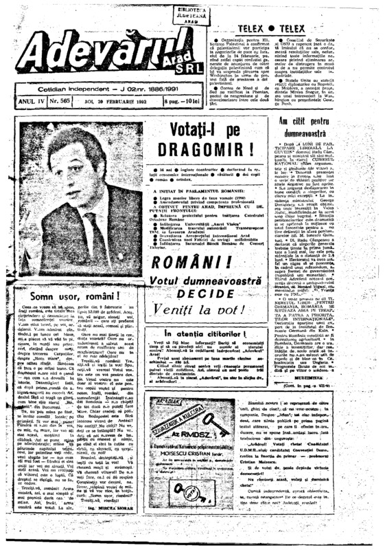 Adevărul, anul IV, nr. 565, 1992-02-20